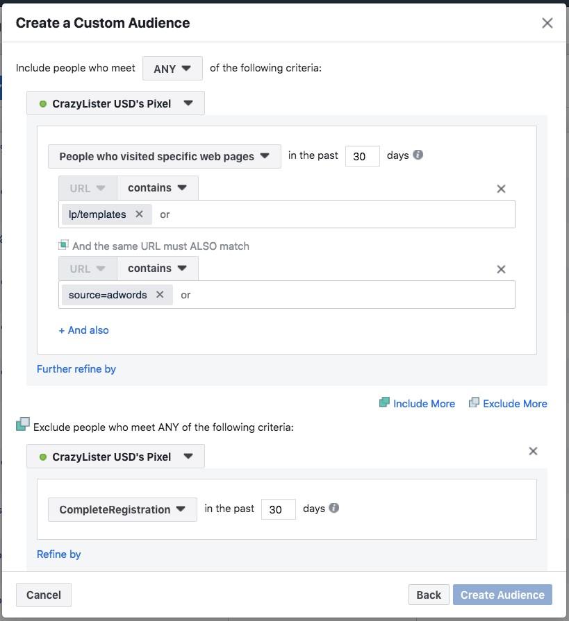 Nó thực sự rất dễ thực hiện (giả sử bạn đang sử dụng các trang đích duy nhất và không gửi mọi người đến trang chủ của bạn). Để đảm bảo bạn đang hiển thị đúng quảng cáo “trả lời” cho đúng người, bạn cần phân loại đối tượng tùy chỉnh của mình trên Facebook. Chỉ cần chuyển đến tab đối tượng và tạo đối tượng tùy chỉnh khớp chính xác với trang đích phù hợp mà quảng cáo trên Google dẫn đến. Đây là cách làm thế nào trong ví dụ sau chúng tôi: